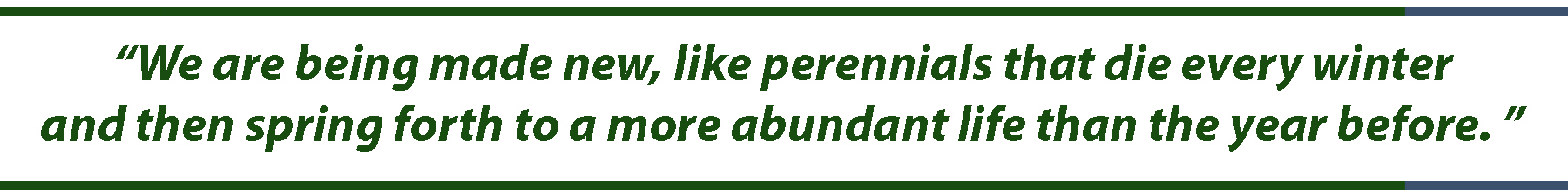 It’s like that in our spiritual gardens as well. We read and pray and seek and confess. We long for Heaven and seek the Kingdom of God. Then, we wake up the following day to find little “weed-lings” of sin alongside God’s bountiful grace. Like seeds that die to bring new life, we, too, had to allow God to put to death our old selves. Only then could the life of Christ resurrect us and make us new creations. However, we are also being made new, year after year, like perennials that die every winter and then spring forth to a more abundant life than the year before. The theological terms for what I’ve described are salvation and sanctification, but Ephesians 2:4-10 explains it like this: