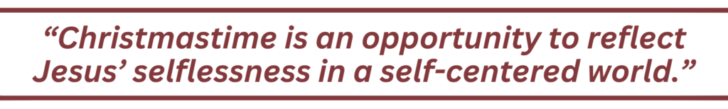 Isn’t it remarkable that Jesus clarifies how we are to love one another? He could have just said, “Love others,” and left it up to us to determine what that looked like. But God, in His infinite wisdom, knowing how much we love ourselves, defined love as sacrificial. Love others so much that you would deny yourself for them. This is the essence of Christmas: Jesus laid down His heavenly existence, denied Himself by coming to earth as a baby, and then took up His cross and loved us to death.
