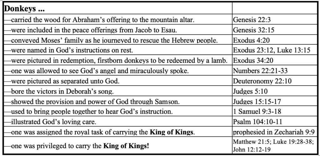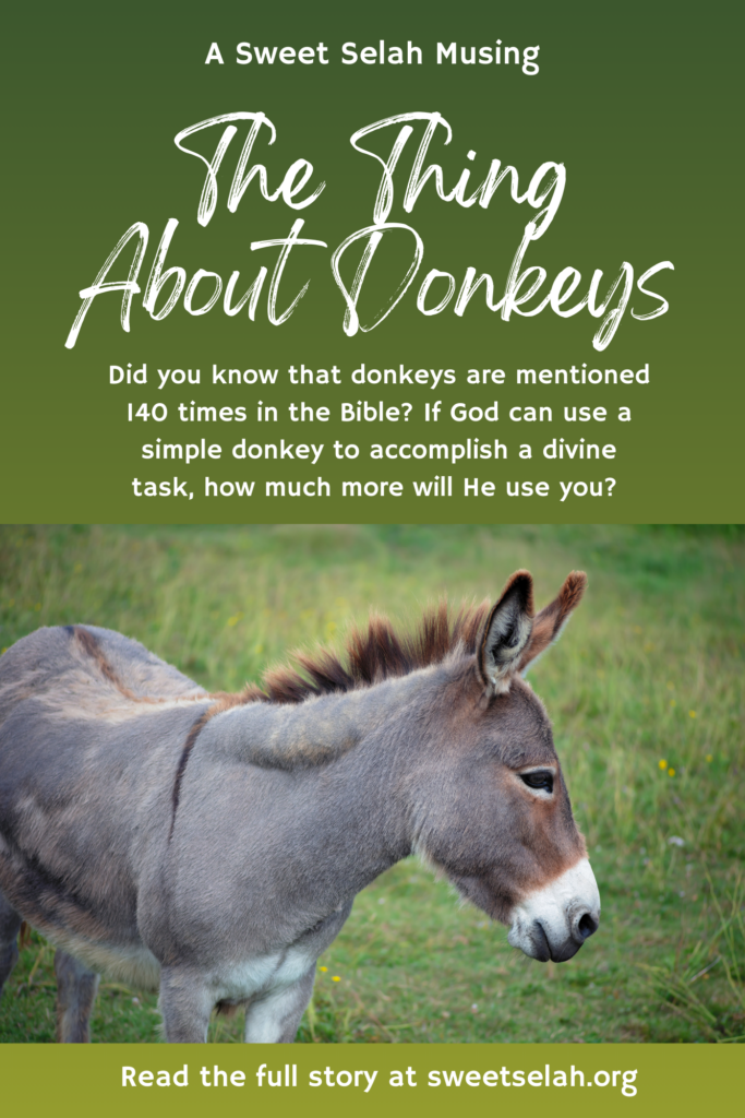Donkeys are mentioned 140 times in the Scripture! They were often pivotal in God carrying out His plan in the lives of His chosen people. Here’s a brief sample: