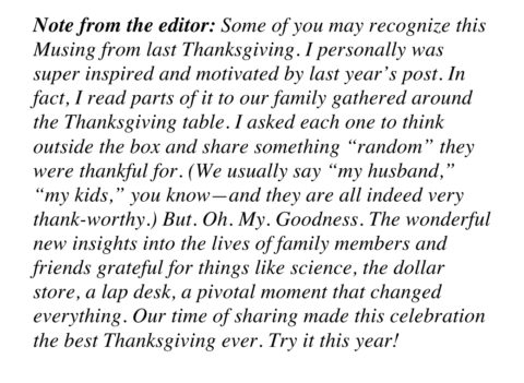 Robert Louis Stevenson wrote a tiny poem in a children’s book that I’ve never forgotten. As a little child, I read: “The world is so full of a number of things, I’m sure we should all be as happy as kings.” Now as an adult, I realize a flaw or two in that poem. For starters, I suspect kings are not nearly as happy as we think they ought to be. Always battling that pesky feeling that someone is after their crowns and then that whole business of running a country probably doesn’t very often lend itself to noticing a world “full of a number of things.” However, I remember thinking how right Stevenson was. Just look at the world and all that is in it! How much there is to be thankful for—including these weird but happy things that spring to mind: