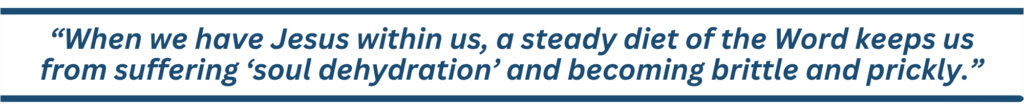 The same is true for spiritual dehydration. Without the Living Water, our souls are dry and frail. However, once we have Jesus within us, a steady diet of the Word keeps us from suffering “soul dehydration” and becoming brittle and prickly. That’s why it is so important to intentionally position yourself “on the back porch,” so to speak, where the rain can reach you! Set your Bible, devotional, and a journal or notebook next to your favorite chair. Make an appointment with Jesus every day, as if you were meeting Him at a coffee shop. Sit and talk. Let the rain of His presence wash over you and revive you. (Just writing this makes me feel refreshed.) It may not make sense, you may think you don’t have time, and you may even forget, but you will never regret the moments you spend in His Word and prayer because it is this time with God that activates the “welling up” of the Spirit of God that satisfies our thirst for Him.