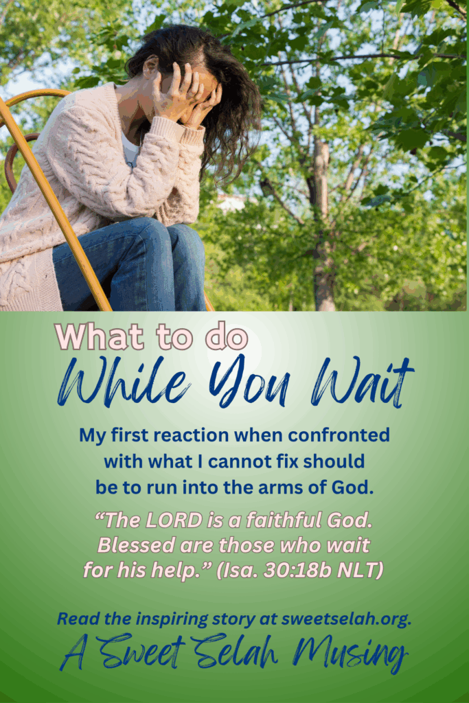 Run to God first. Our verse above tells us that God waits, too: “ … the LORD must wait for you to come to him so he can show you his love and compassion.” Oftentimes, if we have a “fixer” mentality, we are so busy running around trying to get past the waiting that we forget God is waiting for us to come to Him! We must remember that God is filled with love and compassion for those who come to Him. Sometimes, waiting happens just for that reason, so we will turn our hearts away from ourselves and our own problems and nestle into the arms of the One who is always there and who always cares. My first response when faced with something I can’t fix should be to run to Him.