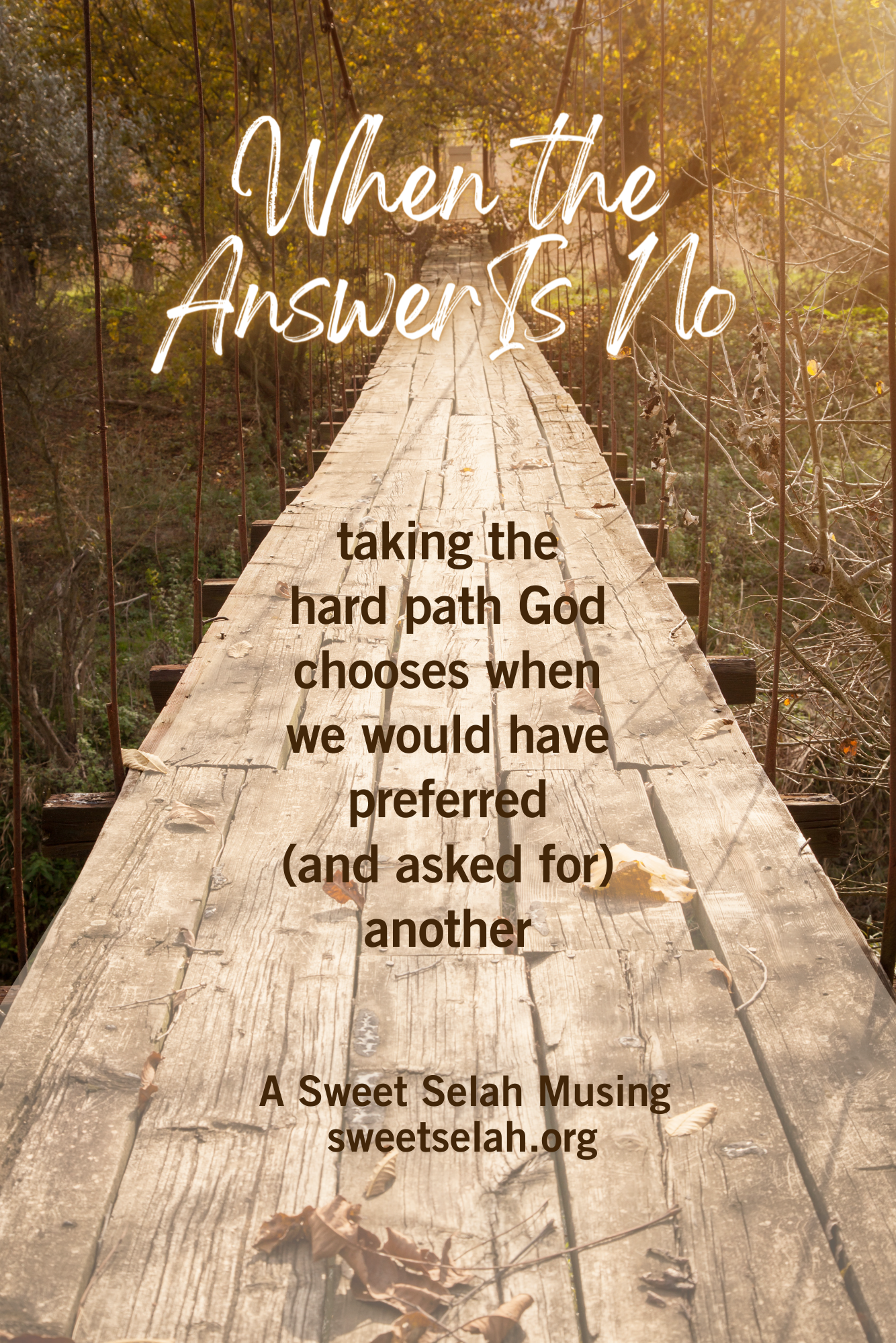 Thank You Sharon. No’s are so hard to hear without the assurance that Gd never leaves us, loves us to the end and meets with us at every step. Even then, the no can be hard. I’ve always been so thankful in the end when I’ve seen how God worked in a situation where He had said no. He way has always been way better. I love you sister in Christ!