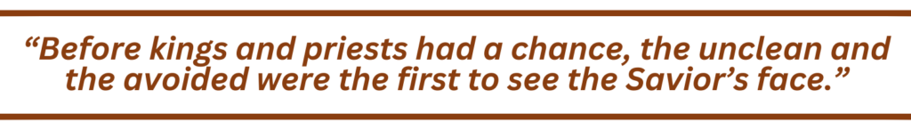 The shepherds went back to the fields, changed men. When the world said they weren’t worthy, the Good News came to them first. Before kings and priests had a chance, the unclean and the avoided were the first to see the Savior’s face.