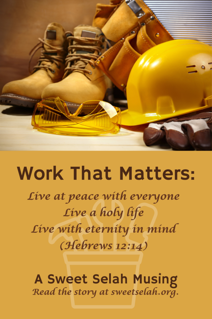 This is work that matters eternally. Someday, everyone we know is going to die. That, of course, includes us. After death, we face judgment. We work at living at peace, and we work at living holy so that others may come to know Jesus, who took the punishment for all who come to Him in repentance so that they can then be declared righteous at the time of judgment. This is serious stuff. We work at what matters so that others can know the Lord who loves them. That’s why.